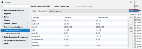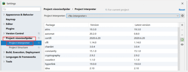 打开解释器选项File --> settings --> Project:项目名--> projectInterpreter