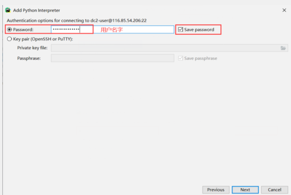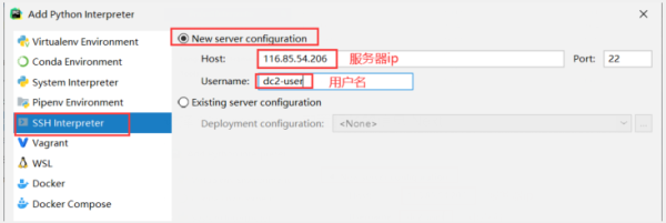 选择SSH interpreter,配置服务器信息,Next
