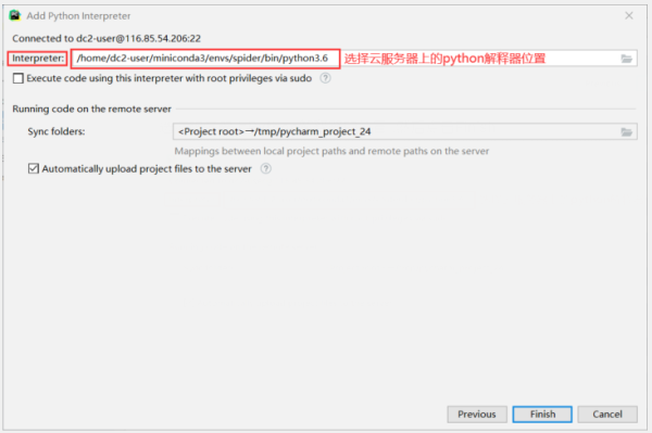 选择服务器上Python解释器的位置,,然后点击Finish