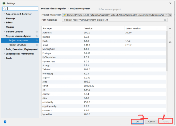 指定解释器为远程解释器,,然后点击Apply,ok