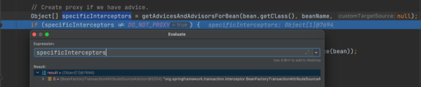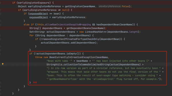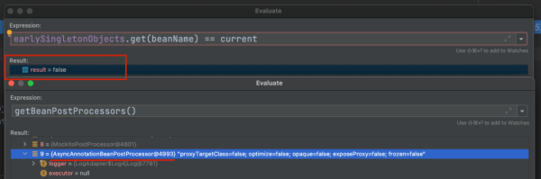 而这两处都有可能生成代理对象, @Transactional 是在 getEarlyBeanReference 处生成的代理对象,所以后面判断 Bean 是否被改变时为 true,而 @Async 是在后面异步生成了代理对象,所以判断不通过。
