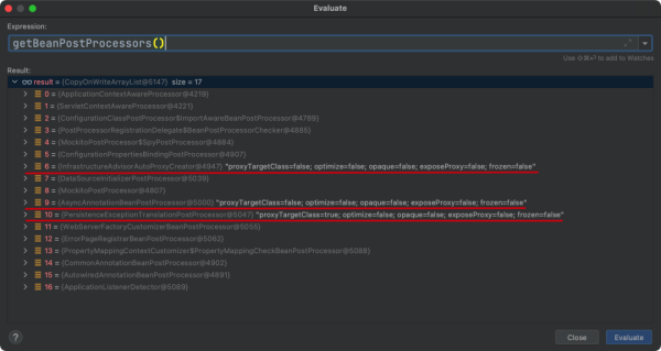事务的处理器 PersistenceExceptionTranslationPostProcessor 也没有执行。