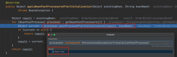 继续 Debug 关注 applyBeanPostProcessorsAfterInitialization