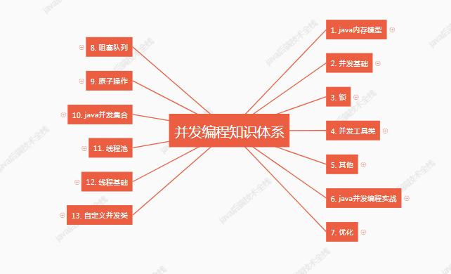 首先看大框架,一共包括了java内存模型、并发基础、锁、并发工具类、java并发编程实战、优化、阻塞队列、原子操作、并发集合、线程池、线程基础、自定义并发类等13个方面的内容: