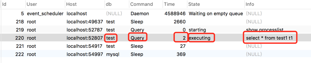 使用show processlist;命令查看当前线程执行情况: