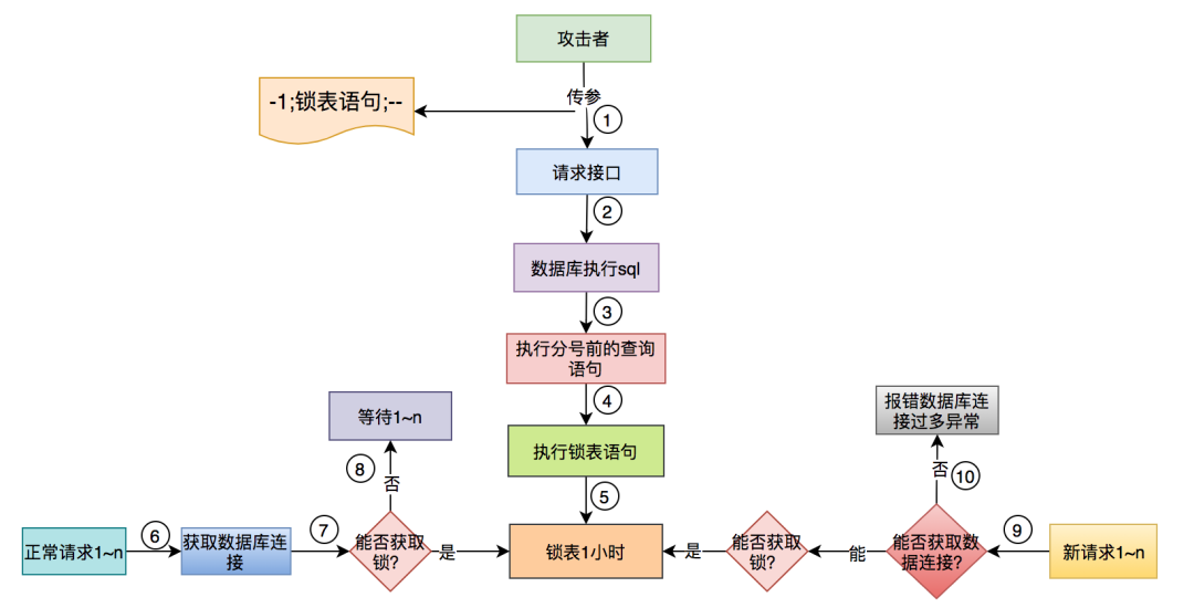 攻击者sql注入了类似这样的参数: -1;锁表语句--。其中 ;前面的查询语句先执行了。由于 --后面的语句会被注释,接下来只会执行锁表语句,把表锁住。正常业务请求从数据库连接池成功获取连接后,需要操作表的时候,尝试获取表锁,但一直获取不到,直到超时。注意,这里可能会累计大量的数据库连接被占用,没有及时归还。 数据库连接池不够用,没有空闲连接。 新的业务请求从数据库连接池获取不到连接,报数据库连接过多异常。