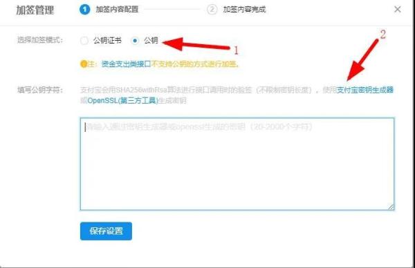 然后点击RSA2(SHA256)后面的设置,点击公钥并下载支付宝密钥生成器或者openssl来生成密钥,这里我选择支付宝密钥生成器,如图: