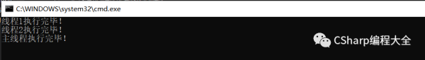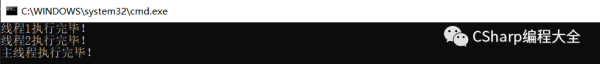 static void Main(string[] args) { Task task1 = new Task(() => { Thread.Sleep(500); Console.WriteLine("线程1执行完毕!"); }); task1.Start(); Task task2 = new Task(() => { Thread.Sleep(1000); Console.WriteLine("线程2执行完毕!"); }); task2.Start(); //阻塞主线程。task1,task2都执行完毕再执行主线程 //执行【task1.Wait();task2.Wait();】可以实现相同功能 Task.WaitAll(new Task[]{ task1,task2}); Console.WriteLine("主线程执行完毕!"); Console.ReadKey(); }执行结果如下: