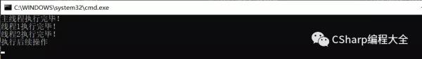 static void Main(string[] args) { Task task1 = new Task(() => { Thread.Sleep(500); Console.WriteLine("线程1执行完毕!"); }); task1.Start(); Task task2 = new Task(() => { Thread.Sleep(1000); Console.WriteLine("线程2执行完毕!"); }); task2.Start(); //task1,task2执行完了后执行后续操作 Task.WhenAll(task1, task2).ContinueWith((t) => { Thread.Sleep(100); Console.WriteLine("执行后续操作完毕!"); }); Console.WriteLine("主线程执行完毕!"); Console.ReadKey(); }执行结果如下,我们看到WhenAll/WhenAny方法不会阻塞主线程,当使用WhenAll方法时所有的task都执行完毕才会执行后续操作;如果把栗子中的WhenAll替换成WhenAny,则只要有一个线程执行完毕就会开始执行后续操作,这里不再演示。
