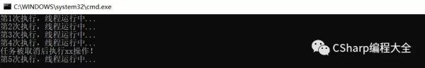 static void Main(string[] args) { CancellationTokenSource source = new CancellationTokenSource(); //注册任务取消的事件 source.Token.Register(() => { Console.WriteLine("任务被取消后执行xx操作!"); }); int index = 0; //开启一个task执行任务 Task task1 = new Task(() => { while (!source.IsCancellationRequested) { Thread.Sleep(1000); Console.WriteLine($"第{++index}次执行,线程运行中..."); } }); task1.Start(); //延时取消,效果等同于Thread.Sleep(5000);source.Cancel(); source.CancelAfter(5000); Console.ReadKey(); }执行结果如下,第5次执行在取消回调后打印,这是因为,执行取消的时候第5次任务已经通过了while()判断,任务已经执行中了: