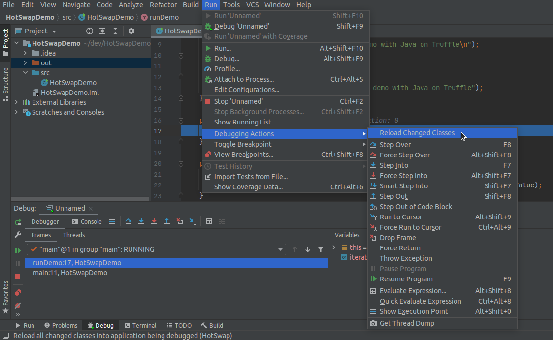 Java on Truffle 有另外一项很酷的特性,比 HotSpot 更强大,这就是增强的热替换(Hot Swap)能力:在调试会话中,运行时改变类。