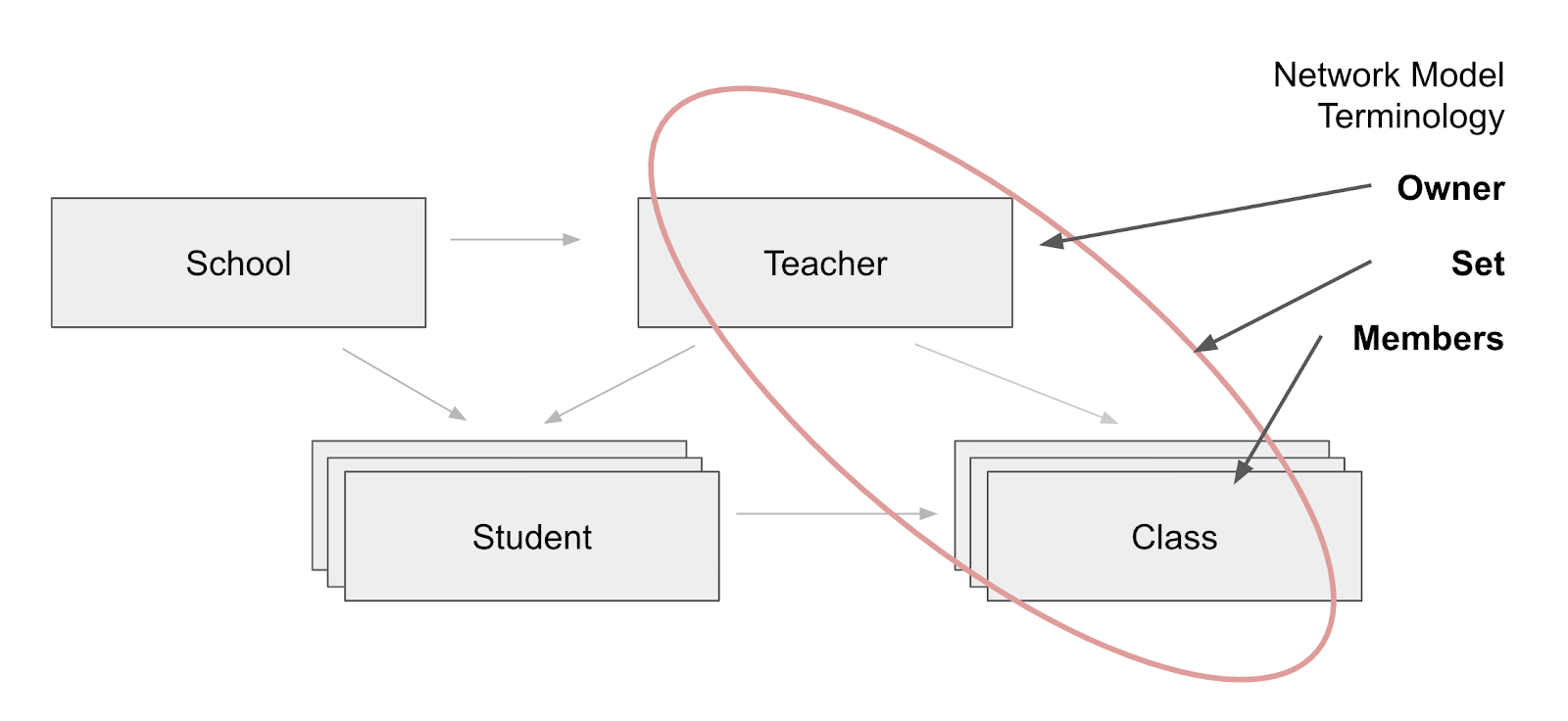 在网络模型中,表之间的关系存储在集合中。每个集合都有一个所有者(即教师)和一个或多个成员(即班级和学生)。