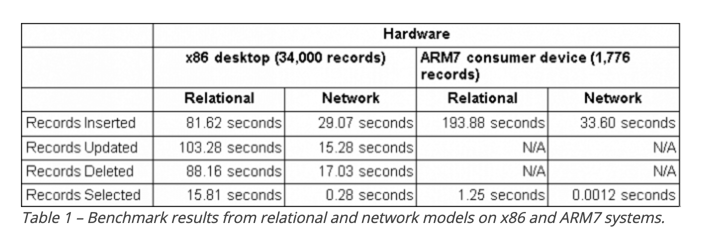 在一个使用真实数据的性能案例研究中,Raima发现,网络数据库模型的插入性能好 23 倍,查询性能快 123 倍。