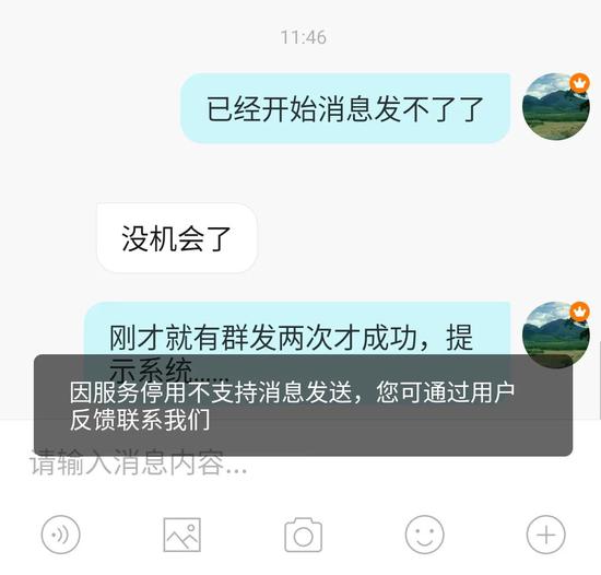 2月1日中午11点50分许,米聊提前十分钟关闭了信息收发功能,有用户此时正与好友告别感慨,还有人正在群里和群友们一起倒计时,尚未做好准备,下一秒便只能看着“因服务停用不支持消息发送”接受停服的现实。