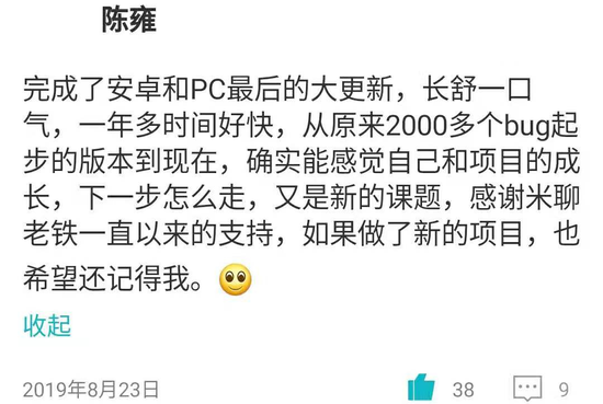 2019年8月23日,在开始“新征程”不到一年后,陈雍在米聊发了一条广播,他在广播里说:“感谢米聊老铁一直以来的支持,如果做了新项目,也希望还记得我。”陈隠从中感知到,陈雍要离开米聊团队了。