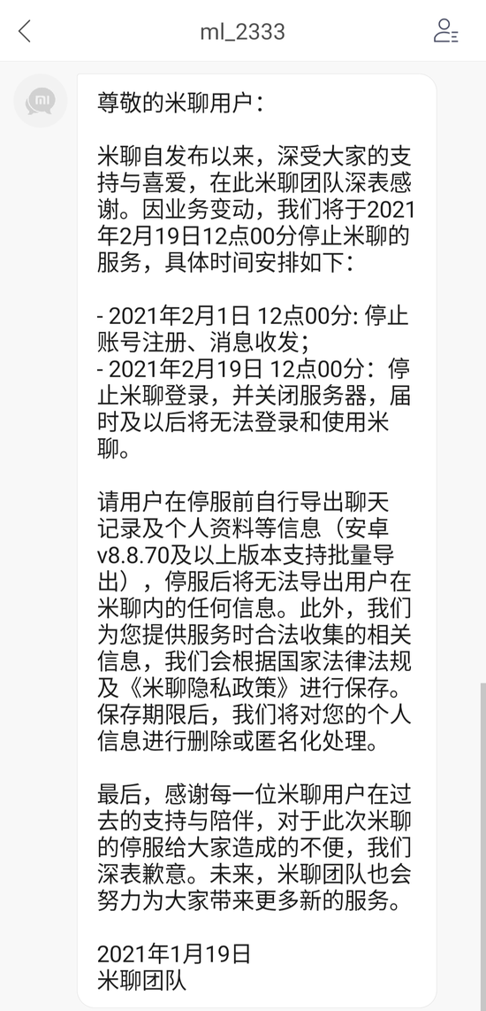 米聊官方号发布的停服公告,图源受访者