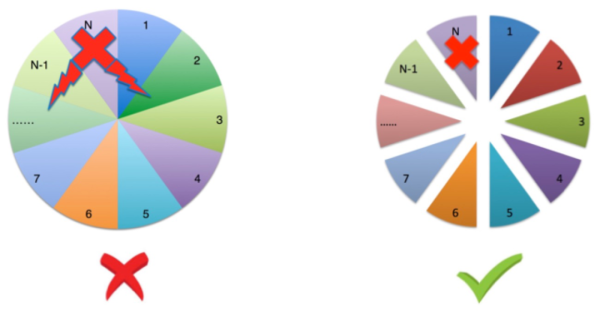 分散,均衡,隔离是控制风险影响范围的 3 个核心原则。打散拆分成 N 份,每一份都是均衡的,且相互隔离,一份有问题,影响范围为 1/N。