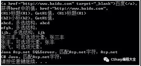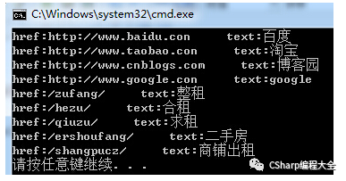 string PageInfo = @"<hteml> <div id=""div1""> <a href=""http://www.baidu.con"" target=""_blank"">百度</a> <a href=""http://www.taobao.con"" target=""_blank"">淘宝</a> <a href=""http://www.cnblogs.com"" target=""_blank"">博客园</a> <a href=""http://www.google.con"" target=""_blank"">google</a> </div> <div id=""div2""> <a href=""/zufang/"">整租</a> <a href=""/hezu/"">合租</a> <a href=""/qiuzu/"">求租</a> <a href=""/ershoufang/"">二手房</a> <a href=""/shangpucz/"">商铺出租</a> </div> </hteml>"; RegexStr = @"<a[^>]+href=""(?<href>[\S]+?)""[^>]*>(?<text>[\S]+?)</a>"; MatchCollection mc = Regex.Matches(PageInfo, RegexStr); foreach (Match item in mc) { Console.WriteLine("href:{0}--->text:{1}",item.Groups["href"].ToString(),item.Groups["text"].ToString()); }显示结果: