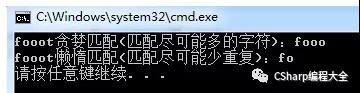 Console.WriteLine("{0}懒惰匹配(匹配尽可能少重复):{1}", f, m2.ToString());显示结果: