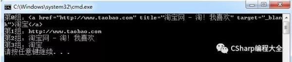 string TaobaoLink = "<a href=\"http://www.taobao.com\" title=\"淘宝网 - 淘!我喜欢\" target=\"_blank\">淘宝</a>"; RegexStr = @"<a[^>]+href=""(\S+)""[^>]+title=""([\s\S]+?)""[^>]+>(\S+)</a>"; Match mat = Regex.Match(TaobaoLink, RegexStr); for (int i = 0; i < mat.Groups.Count; i++) { Console.WriteLine("第"+i+"组:"+mat.Groups[i].Value); }显示结果: