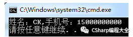 string Resume = "基本信息姓名:CK|求职意向:.NET软件工程师|性别:男|学历:本专|出生日期:1988-08-08|户籍:湖北.孝感|E - Mail:9245162@qq.com|手机:15000000000"; RegexStr = @"姓名:(?<name>[\S]+)\|\S+性别:(?<sex>[\S]{1})\|学历:(?<xueli>[\S]{1,10})\|出生日期:(?<Birth>[\S]{10})\|[\s\S]+手机:(?<phone>[\d]{11})"; Match matc = Regex.Match(Resume, RegexStr); Console.WriteLine("姓名:{0},手机号:{1}", matc.Groups["name"].ToString(), matc.Groups["phone"].ToString());显示结果: