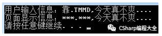 string PageInputStr = "靠.TMMD,今天真不爽...."; RegexStr = @"靠|TMMD|妈的"; Regex rep_regex = new Regex(RegexStr); Console.WriteLine("用户输入信息:{0}", PageInputStr); Console.WriteLine("页面显示信息:{0}", rep_regex.Replace(PageInputStr, "***"));显示结果: