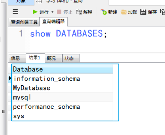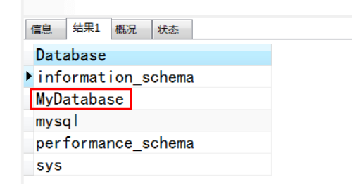 再通过show DATABASES;命令查看当前有哪些数据库,可以发现确实多了刚才新建文件夹(数据库)。
