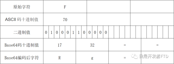如上表所示,由于字符F的二进制为01000110,按照每6位进行分组,此时只能分成一组,第二组缺少4位,如果位数不足时,用0补齐;第三组和第四组完全没有数据,则用**=「补上。因此,字符F经过Base64编码后得到的数值为」Rg==**。