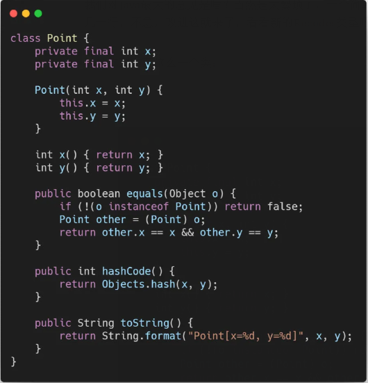 这是一个典型的不可变的数据对象,equals ()方法, hashCode()方法,toString()方法其实都是比较通用的。但是我们不得不为它多写那么几行代码。虽然有IDE的鼎力协助,但是看上去还是不怎么爽(如果没有IDE,更要哭了)。不过没事Records来了!用Records来表示上面的类,你只需要: