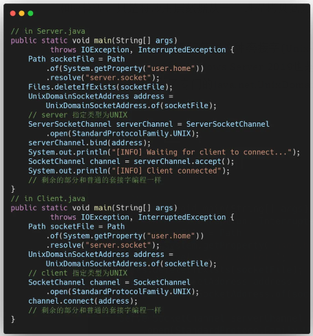 在Java 16中,已经可以直接使用这种套接字(Unix-domain (AF_UNIX),虽然叫做UNIX套接字,windows 10和Windows Server 2019也是可以使用的)了。为了支持Unix Domain套接字,新增了专门的java.net.UnixDomainSocketAddress类,下面看一下它的使用: