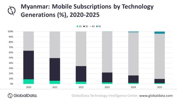 据GlobalData预测,近几年缅甸的4G用户将持续高速增长,在2025年达到近90%,5G也将从2023年开始萌芽。