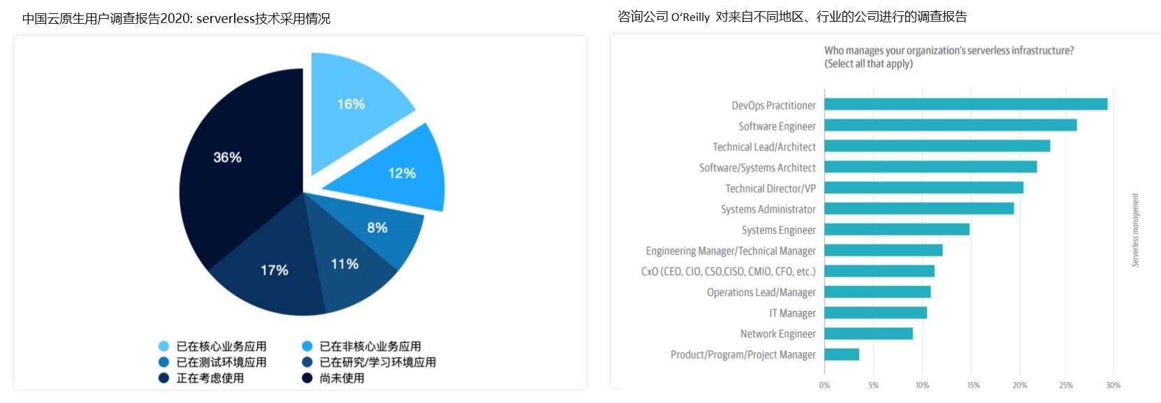 上图左侧为 2020 年中国云原生用户调查报告中 Serverless 技术在国内的采用情况,图中显示近三成用户已经把 Serverless 应用在生产环境中,16% 的用户已经将 Serverless 应用在核心业务的生产环境,12% 的用户也已经在非核心业务的生产环境中用到 Serverless,可见国内对 Serverless 接受度较高。