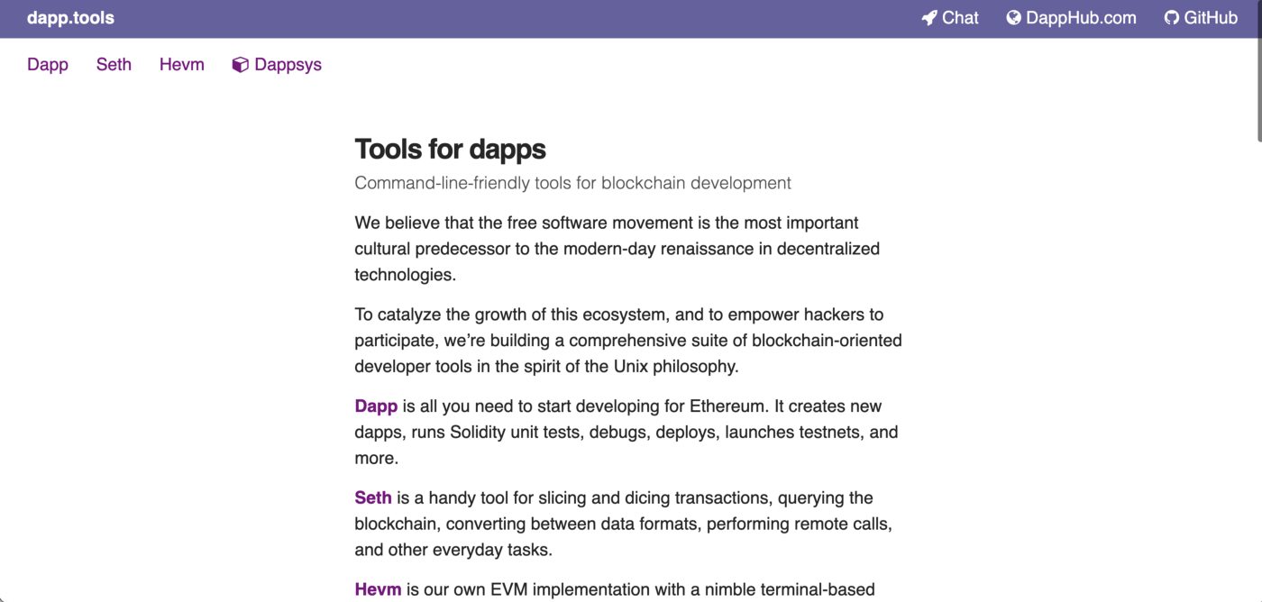 MakerDAO 使用了Dapp.Tools,它也惊艳了我一把。它是用 Haskell 编写的,但支持许多我们喜欢和常用的插件,例如 OpenZeppelin。它看起来像一个极简主义的框架,但功能强大到足以做到你想做的事情。我可以找到关于使用这个平台部署合约的帮助,另外它的简洁也给人留下了深刻印象。如果你正在寻找一个对命令行友好的极简主义框架,那么我建议你也看一下这一款。