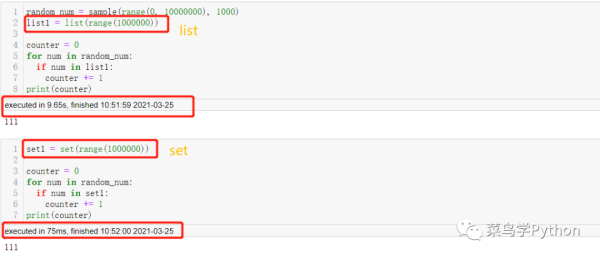 在Python程序中,对于list列表进行 for i in list1的操作时,其时间复杂度为O(n),而对于set进行for i in set1的操作,时间复杂度为O(1)。所以在程序的执行时间上,就会出现非常大的差距。