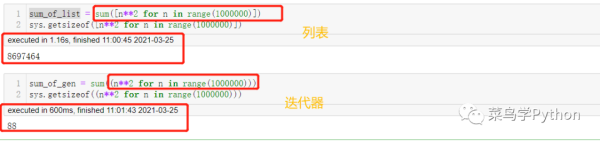 利用迭代器来代替列表,已经逐渐的成为了Python编程者使用的一种方法,利用迭代器的操作,不仅可以节省时间,更重要的是可以节省大量的内存空间,上图中,利用列表的操作需要占用大约8M的内存,但是迭代器只需要88个字节。