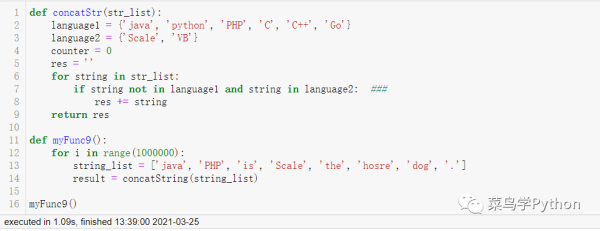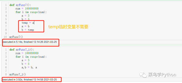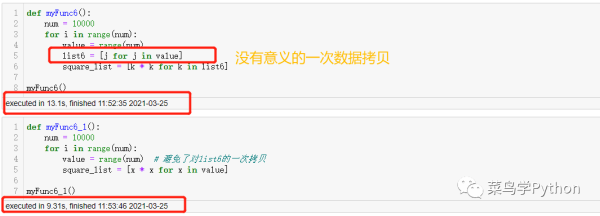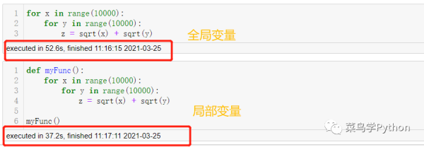 上图程序中,全局的变量z放入到函数myFunc中,局部变量的执行时间要小于全局变量,因此程序执行的时间也大大的缩短。