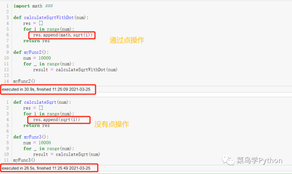 上图中可以看到,calculateSqrtWithDot函数和calculateSqrt函数唯一的区别在于是否通过点操作来调用sqrt函数。每当我们点操作来调用函数时,就会触发特定的方法,例如,__getattribute__() 和__getattr__(),这样的方法会调用字典操作,从而带来时间的消耗,因此在程序调用第三方库时候,可以尽量使用from xx import xx的方法来进行调用。