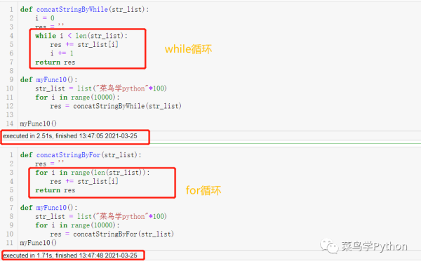 上图的程序中,可以看到,同样的功能利用for循环来替代while循环,for循环的速度要快于while循环。