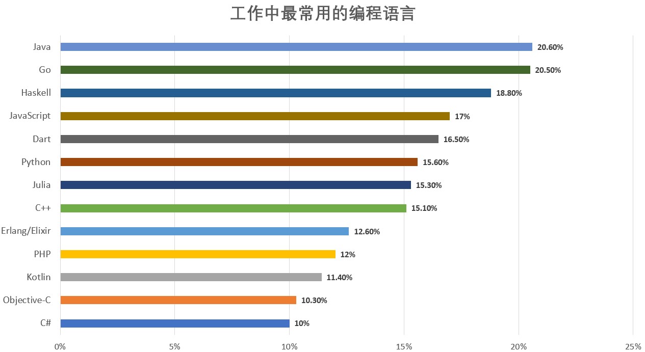 Go 语言以 20.5%的得票率排名第二,而 Haskell 排名第三,得票率为 18.8%。