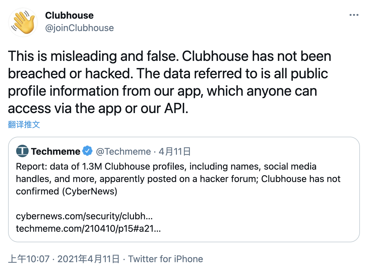 Clubhouse 方面也发布推文表示,“相关报道是误导和错误的。Clubhouse 没有被侵入或黑入,引用的数据是我们应用程序中的所有公开资料信息,任何人都可以通过应用程序或我们的 API 访问这些信息。”
