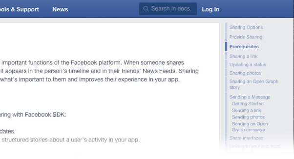 此类文档的制作步骤通常是:先添加言简意赅的标题目录,然后将文档分门别类地拆分为不同的专题部分,最后将每个部分与相关的标题对应起来。下图是Facebook的一个结构良好的文档示例,我们只需在右侧目录单击要查阅的标题,左边会立刻自动定位到相应的内容。