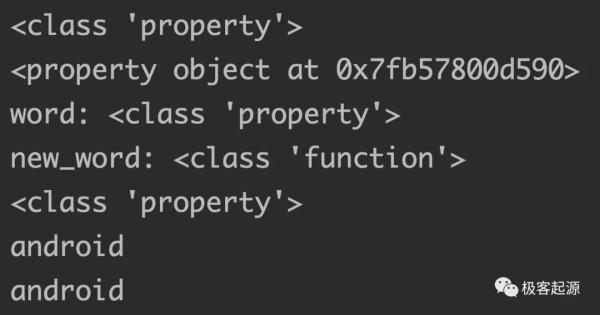 可以用下面的代码来演示property装饰器的原理。在这段代码中,使用@property修饰了word方法,而new_word方法直接通过创建property实例的方式修饰。