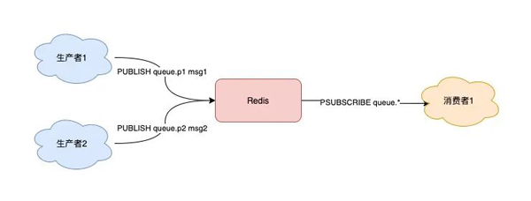 127.0.0.1:6379> PUBLISH queue.p1 msg1 (integer) 1 127.0.0.1:6379> PUBLISH queue.p2 msg2 (integer) 1