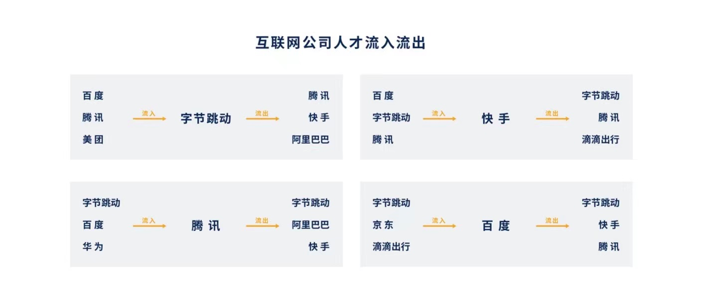 以字节跳动为例,除了资讯、短视频领域,字节跳动已将业务拓展至在线教育、电商、游戏、自动驾驶、芯片等多个领域。有媒体统计,字节跳动员工数在 2018 年时不过两三万左右,但目前已经达到了 10 多万名。脉脉数据研究院数据显示,字节跳动成为 2020 年最多人才流入的新经济公司,其次是阿里巴巴,快手位于第三。
