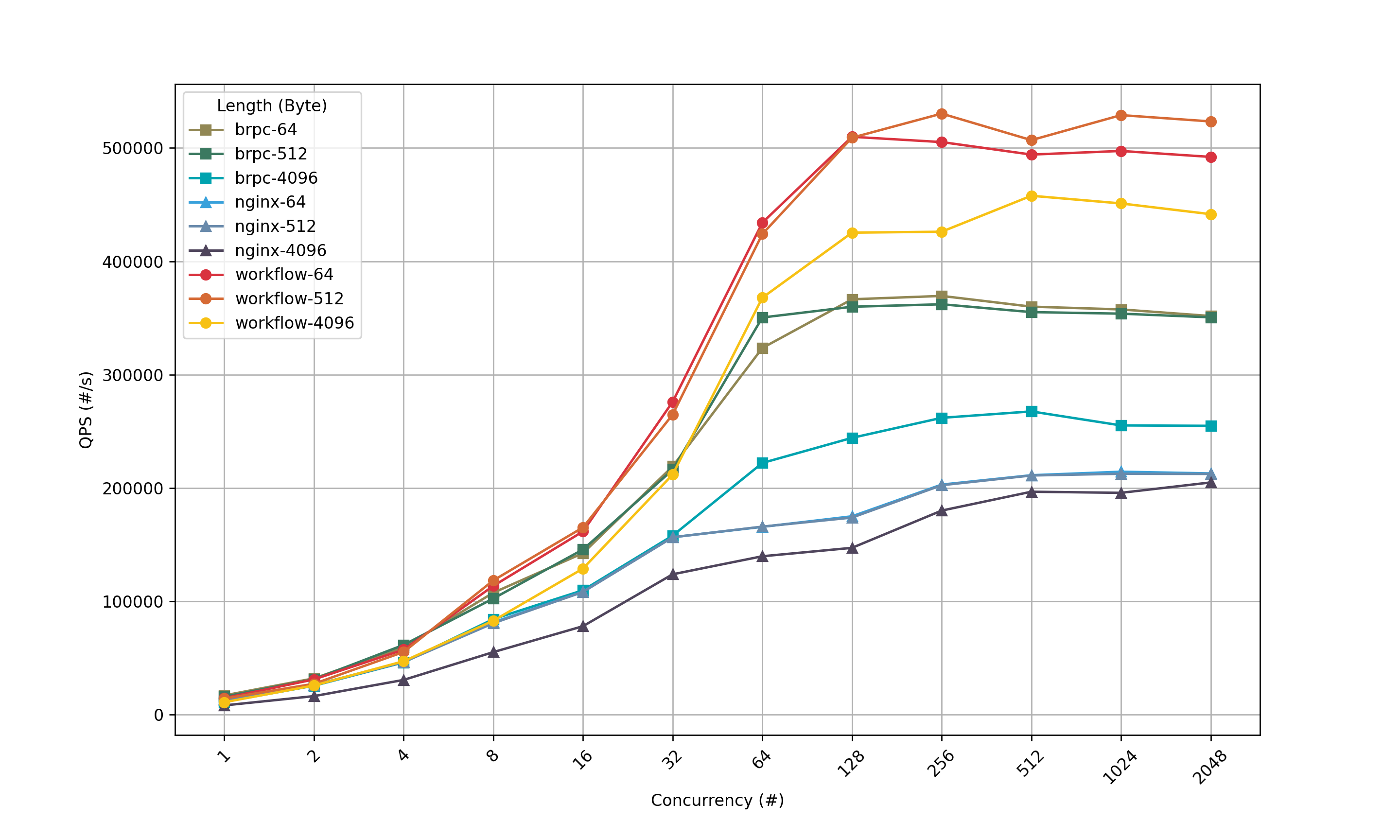 以上是在同一台机器上用相同的变量做的 wrk 压测,具体可以到 github 查看机器配置、参数及压测工具代码。当数据长度保持不变,QPS 随着并发度提高而增大,后趋于平稳。此过程中 workflow 一直有明显优势,高于 nginx 和 brpc。 特别是数据长度为 64 和 512 的两条曲线, 并发度足够的时候,可以保持 50W 的 QPS。