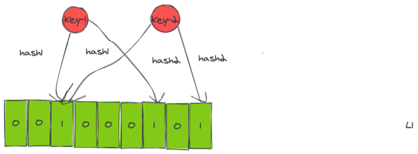 布隆过滤的组成可以当作一个位数组和几个计算结果比较均匀的 hash 函数,每次添加 key 的时候,会把 key 通过多次 hash 来计算所得到的位置,如果当前位置不是 0 则表示存在。