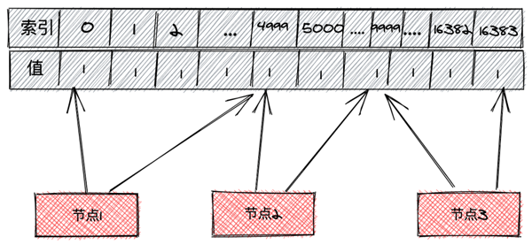 从上图可以看到:节点 1 只负责 执行 0 - 4999 的槽位,而节点 2 负责执行 5000 - 9999,节点 3 执行 9999- 16383 。