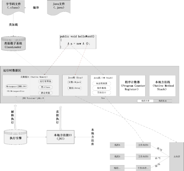 如上图所示,在Java内存模型中,对于用户程序来说用得最频繁的就是堆内存和栈内存,其中堆内存主要存放对象及数组,例如由new()产生的实例。而栈内存则主要是存储运行方法时所需的局部变量、操作数及方法出口等信息。