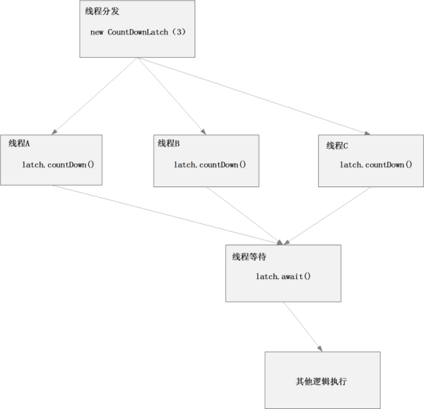 在并发编程中,一个复杂的业务逻辑可以通过多个线程并发执行来提高速度;但如果需要同步等待这些线程执行完后才能进行后续的逻辑,那么就可以通过CountDownLatch来实现对多个线程执行的同步汇聚。其逻辑示意图如下: