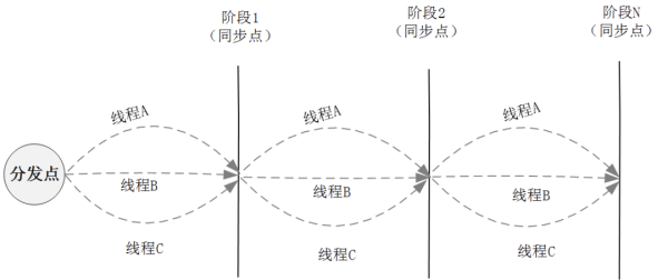 CountDownLatch的功能主要是实现线程的一次性同步。而在实际的业务场景中也可能存在这样的情况,执行一个阶段性的任务,例如”阶段1->阶段2->阶段3->阶段4->阶段5"。那么在并发处理这个阶段性任务时,就要在每个阶段设置栅栏,只有当所有线程执行到某个阶段点之后,才能继续推进下一个阶段任务的执行,其逻辑如图所示: